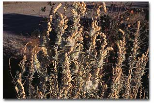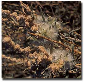 Winterfat is a compact perennial shrub that grows to about three feet. The base of the shrub has yellowish, fibrous wood with flaky or exfoliating bark. This base is about four inches tall. From this base long stems grow each year. The stems, branchlets and leaves are covered with dense long hairs that give the plant a silvery appearance. Leaves, with inrolled margins, are linear or lance-shaped (lanceolate), and they arise alternately along the stems and branches, and range from 3/8 to 1 _ inches long. Flower clusters are borne in leaf axils on the upper portion of the stems. Small spikes of male and female flowers are arranged separately but on the same plant. This type of arrangement is called monoecious, meaning "one home" meaning that both the male and female flowers are borne on one plant. Generally, there are two to four male flowers in a small clusters, while there are many female flowers borne along a short stem. The flowers lack normal petals and sepals. Two simple bracts with horny tips enclose the fruit at maturity. Even the fruits have long hairs. Winterfat blooms from mid-spring to summer. Fruits may remain on the plant thru the winter.