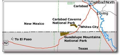 Carlsbad is located in the southeast corner of New Mexico, about 25 miles north of the Texas border. It is serviced by two highways: U.S. 285 traveling north and south, and U.S. 62/180 traveling east and west. Mesa Air offers daily flights to Albuquerque connecting with 9 major airlines to all points. Cavern City Air Terminal. offers overnight tie-downs, hangars(fee) and 100 Octane and jet fuel. Tel. 505-885-5236.