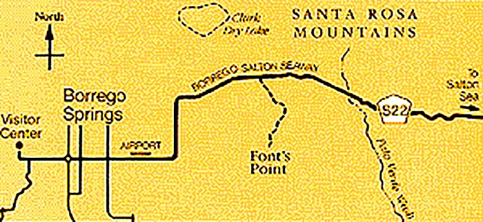 One-way, 18-mile (1 hour) drive east from the Visitor Center along County Road S-22 (Borrego-Salton Sea Way). Erosion Road tour is an introduction to the geology of the Anza-Borrego Desert. It includes stops at the Coyote and Santa Rosa Mountains, Font's Point, Clark Dry Lake, Font's Point Wash and an overlook of the Borrego Badlands and Salton Sea. It demonstrates the constant conflict of geologic forces at work here -- faulting and erosion -- to form mountains, canyons, alluvial fans, playas, bajadas etc.. The geology of Anza-Borrego also highlights the effects of the San Jacinto Fault, the most active branch of the famous San Andreas Fault. A brochure with map is available from park offices. It describes each of the 10 stops, identified by the mileage the marker which precedes it, plus the fractional mileage off-road from that marker.