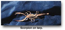 What is the worst thing that can happen to you when you are out prowling around in the mountains? "See any rattlesnakes out there?" people ask. I saw one once. It hissed and rattled and ran away as rattlesnakes do when they have half a chance. "Aren't you afraid of mountain lions?" Not as much as the sheep are, I suppose. "And scorpions. Don't scorpions scare you?" I did discover a small one on the tarp under my tent one morning when I camped out there. I wished it a nice day and it departed after pausing for a photo op.