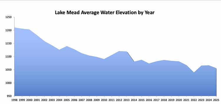 By July 2026, elevation is likely to fall below 1,050 ft, triggering a Tier 2 shortage, which results in greater reductions in water supply to Nevada (~4,000 ac-ft/year) .