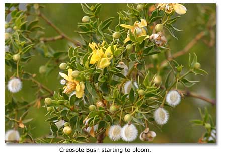 First, plants have found ways to capitalize on the limited water and nutrients. According to James A. MacMahon’s Deserts (one of The Audubon Society Nature Guides), perennials grow in a pattern that mirrors the distribution of resources in the soil. Creosote Bushes, classically, grow at a more or less equidistant spacing in those soils where water and nutrients are uniformly distributed; they use the span and depth of their root systems to guard their territory. On the other hand, they may gather in clusters in soils where resources are concentrated. The Creosote Bushes may also share their territory with other species provided their neighbors have different rooting strategies. They often share space with ephemerals, which grow in the shelter of the perennial’s mothering shade.