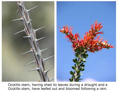 Some perennials, for instance, the Ocotillo, follow still another strategy for surviving in the desert. During a dry period, they simply enter a state of dormancy, a kind of botanical “sleep,” halting their growth and shedding their leaves while they wait for rain to come. When the rains do arrive at last, the Ocotillos quickly sprout new, wax-coated leaves and produce festive new red blooms.