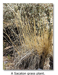 Sacaton, three to six feet tall, grows in flood-prone basins and flats between 3100 to 7000 feet in elevation. Palatable to grazing animals during its growing season, Sacaton has grayish-green stems with foot-long leaf blades. Its open, multiple-branched spikelets may cover one to two feet of the stem.