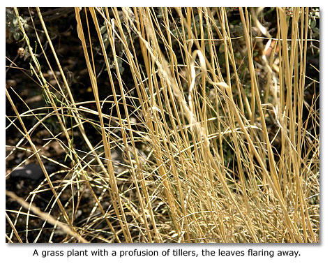 Like its kin throughout the world, a desert grass plant produces several stems, or “tillers,” from its base, or “root crown.” Each tiller resembles a series of segments joined, like a pipeline, end to end. (The tiller of a bamboo, the largest of the grasses, serves as a vivid illustration of the jointed segment appearance.) Each segment of the tiller has its own two-part leaf. One part, the sheath, fits like a sleeve along all or most of the length of its host segment. The second part, the blade, flares away from the tiller at the segment’s uppermost “joint,” or “node.” The leaf blades therefore alternate, one occurring at each node, along the length of the tiller. The tiller produces its flowers near its top, within structures called “spikelets.” In our deserts, the flowers’ pollen scatters with the wind from plant to plant, according to McClaran.
