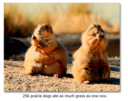 Prairie dogs took on the proportions of a plague in the desert grasslands. Early in the 20th century, “prairie dog towns were estimated to have covered 2.5 million ha [one ha, or hectare, equals about 2.47 acres] of choice grazing land in [Arizona],” according to Parmenter and Van Devender. One writer, quoted by Parmenter and Van Devender, said that the “Animas Valley [roughly 300 square miles in southwestern New Mexico] was an almost continuous prairie dog town for its whole length and breadth. In many places where rain had missed a part of the valley the prairie dogs had taken all the season’s vegetation and made barren deserts miles in extent.” The writer estimated that the prairie dog population of southwestern New Mexico’s Grant County would equal 6,400,000. Since 256 prairie dogs ate as much grass as one cow, the population would consume forage that would feed 25,000 cows. Ranchers did not like prairie dogs. They exterminated them.