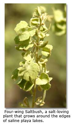 The salt- and high-heat-tolerant Four-wing Saltbush, a 1- to 6-foot high perennial evergreen shrub, found its quintessential home in the Mojave Desert, growing around the margins of the inland basin’s dry mineralized lake beds. A member of the goosefoot family which includes weeds such as Russian thistle and pigweed and cultivated plants such as spinach and sugar beets the Four-wing Saltbush has thin half-inch long, pale green leaves that grow either singly or clustered on heavily branched stems. “The young stems and leaves are covered with minute white scales called scurf, which helps protect the plant against water loss,” according to DesertUSA, and the mature leaves cloak themselves with small scales. Another of the extensive exploiters, the Four-wing Saltbush has a multiple-branched root system that may penetrate as much as 40 feet below the surface, according to Texas A&M University’s horticulture Internet site. It produces inconspicuous yellow blooms from spring through fall. Its seeds, enclosed in distinctive capsules with four papery wings, give the plant its name.