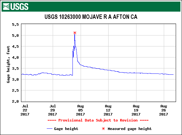 Desert Safety Tip: Visitors need to be careful when exploring the desert during our infrequent, but powerful summer rain events. Last month, Afton Canyon experienced a large flash flood during a one day rain event. As can be seen from the staff gauge readings located in the canyon (see below), this event resulted in a sudden surge of water through the canyon — almost doubling normal water depths over night. As captured by U.S. Geological Survey (USGS) monitors, this was a powerful flood event. In fact, this event lead to a derailment of a train going through the canyon at the time. So be sure to be careful when recreating in desert canyons during summer storms! Video by Chris Otahal, BLM.