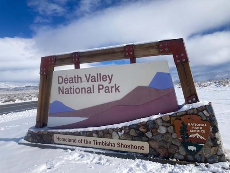 Snow at Death Valley National Park’s CA-190 west entrance on February 8. NPS/Elyscia Letterman