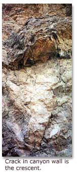 One cloudy day, I walked out to the center of the ledge to take a break from my intense search. For some reason, I looked up, and there about 20 feet above me, up on the canyon wall, I saw the crescent for which I had been searching. I could only see it from a certain angle and while out away from the wall. It ran through a place where a large piece of the wall had broken loose, leaving an overhang that shaded a large space below, making it difficult to see on sunny days. It was directly below where I thought the missing trail marker should have been. The curved arrow on the map pointed directly at it. Had I seen it sooner, I would have saved a lot of time and effort, but at last, I had found the starting place for a diagram which should take me to the Lost Dutchman’s Mine.