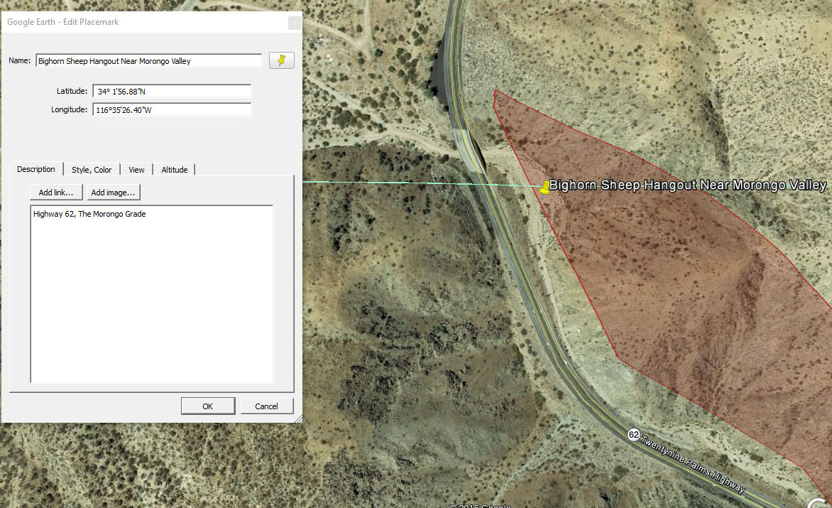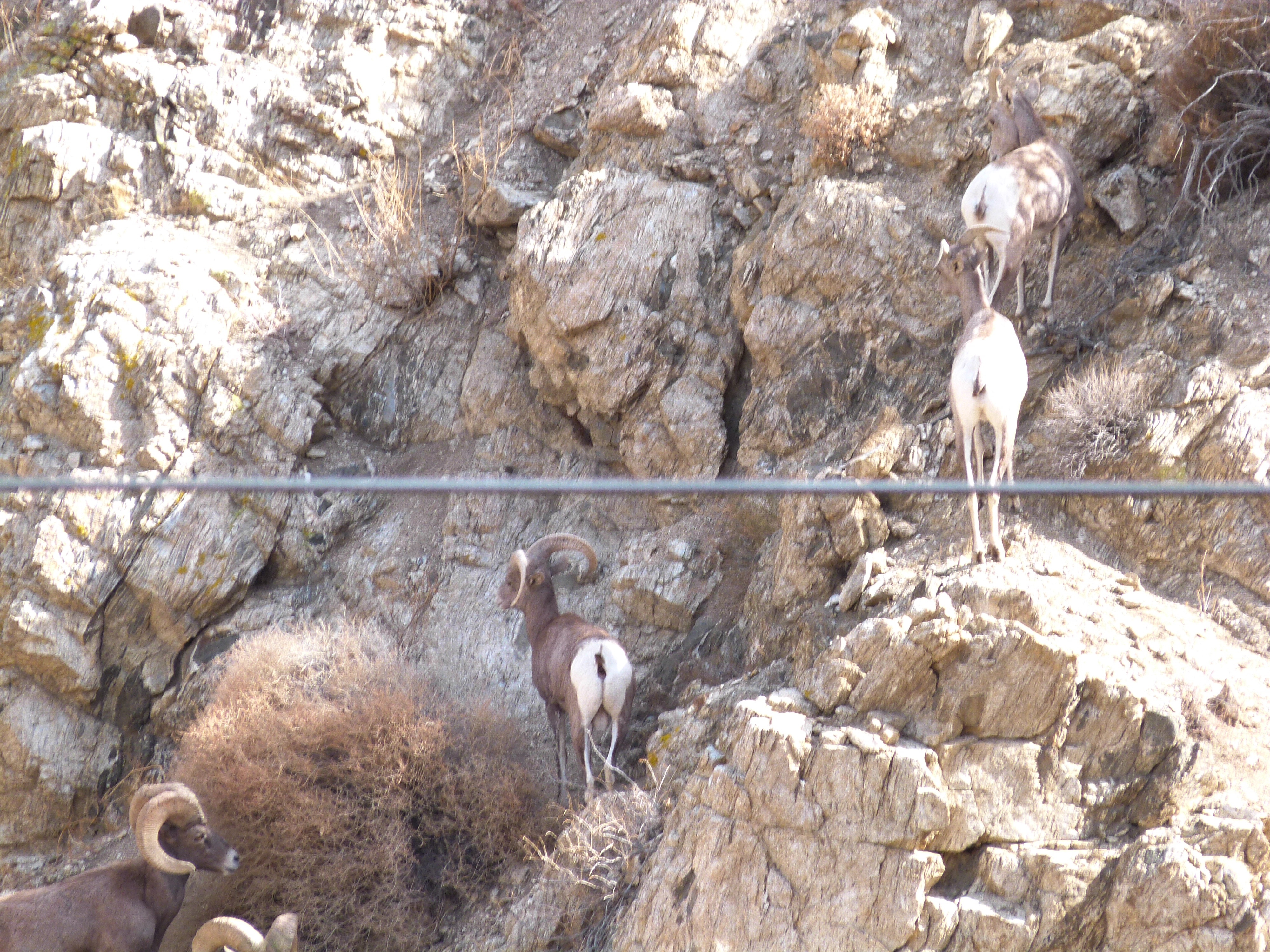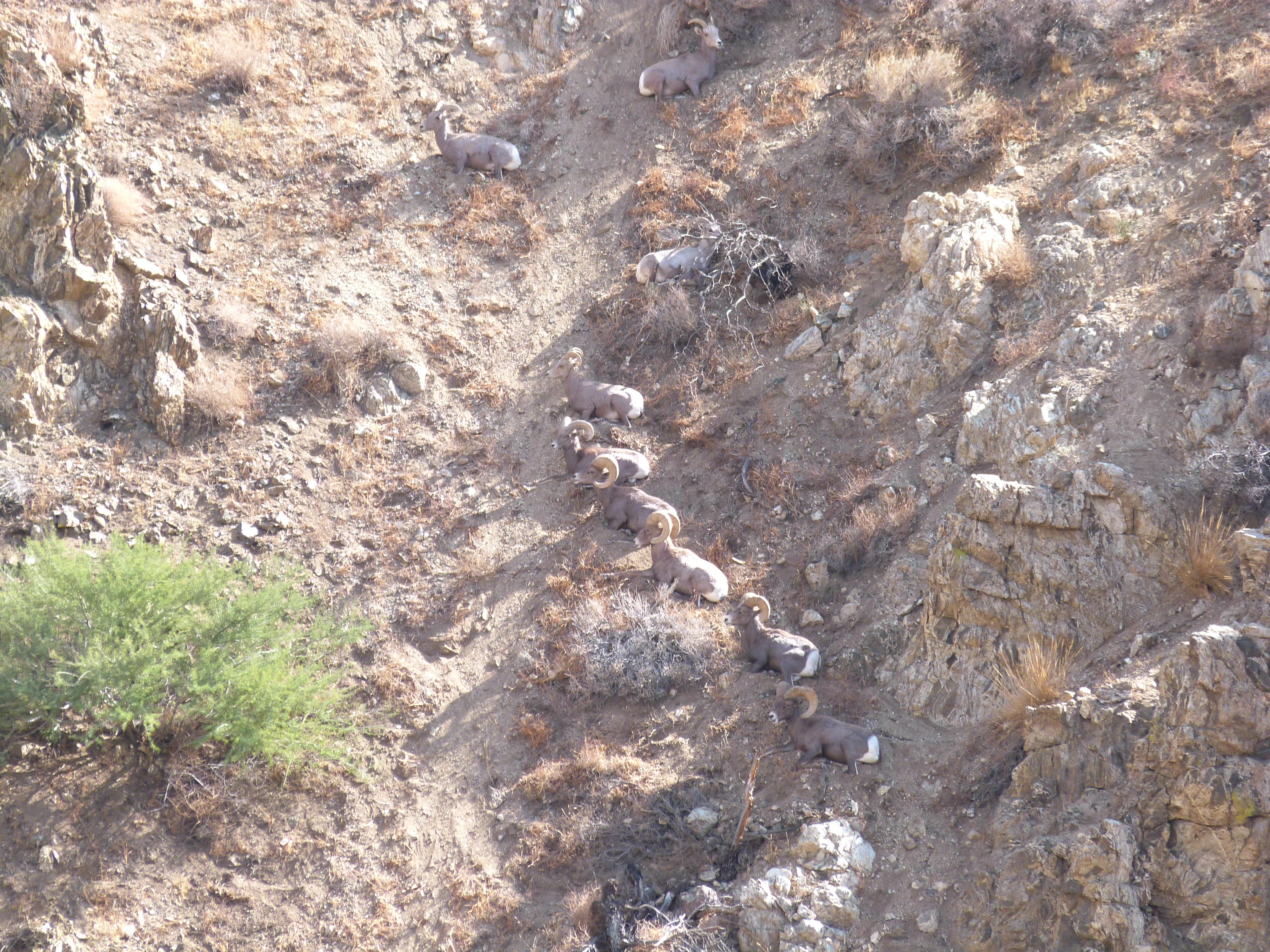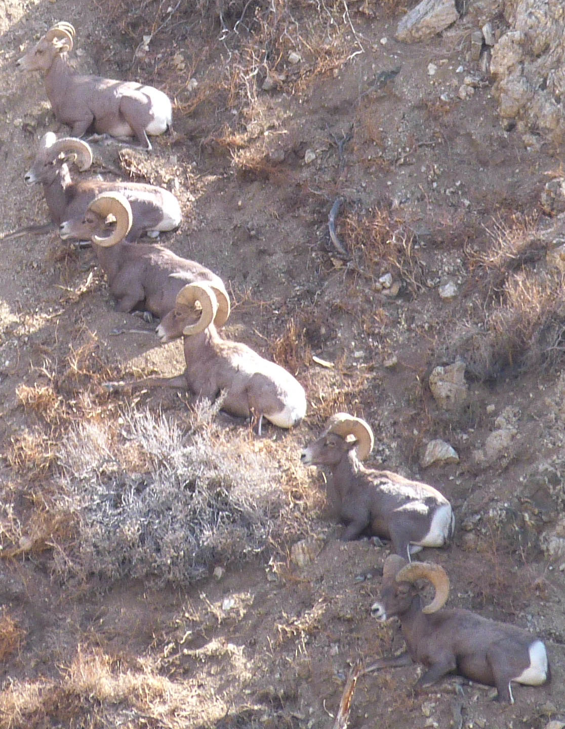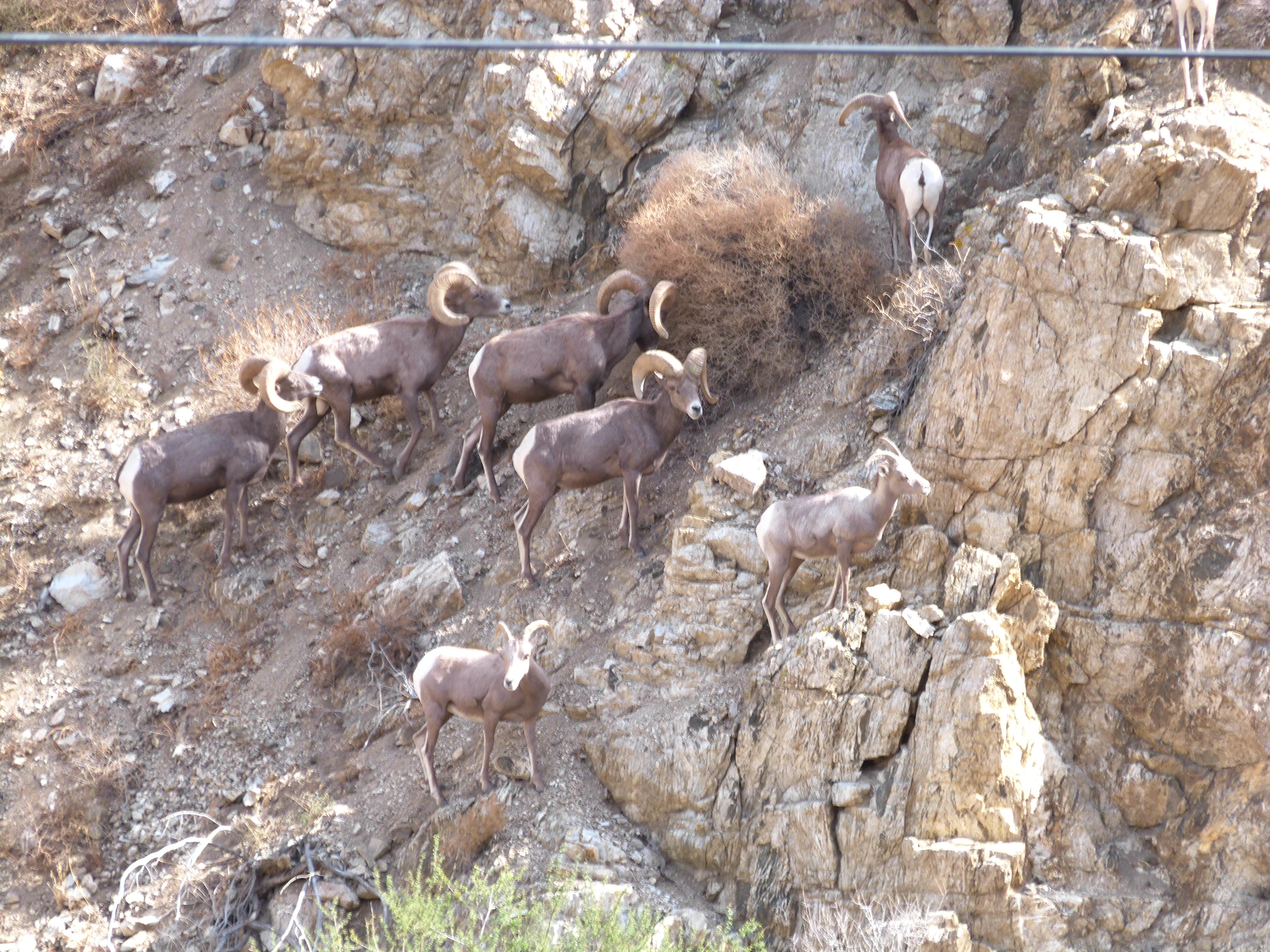 A few years ago I was headed up the Morongo Grade between Desert Hot Springs and Morongo Valley on Highway 62 and I saw my first bighorn sheep on the grade. Since that day, I’ve seen them several times – with the most recent sighting just a few days ago. I had to drive down the hill towards Palm Springs, and I saw bighorn sheep on the east side of the road but could not turn around for a few miles due to the concrete median. I know now from my own experiences and speaking with others, that the sheep like to hang out there in the spring and fall, so I look for them. When I encountered them just a few days ago I turned around and headed back up the hill and saw again the herd I had just seen going down the hill only a few minutes ealier. My first pictures were taken with my cell phone, then I used my Lumix Camera. Here are the pictures from these encounters on the Morongo Grade a few days ago and some from other times; I hope you enjoy them. I can’t always stop to take pictures, but I have seen them half a dozen times in this area. This was the biggest herd I have seen so far.