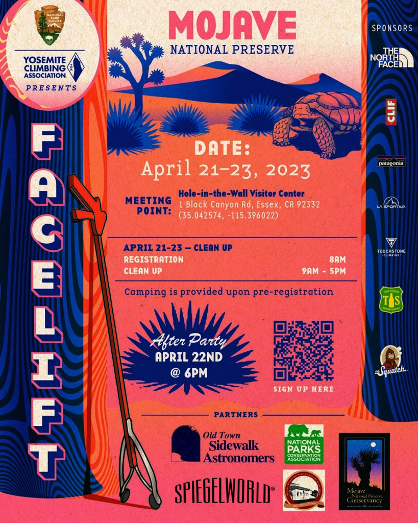 The very special event has limited space. Campsites are available for those who sign up early. This family friendly event is for everyone. Learn more about this special opportunity and sign up at: https://www.yosemiteclimbing.org/2023-mojave-facelift
