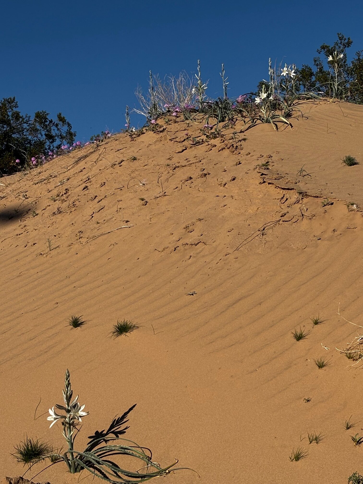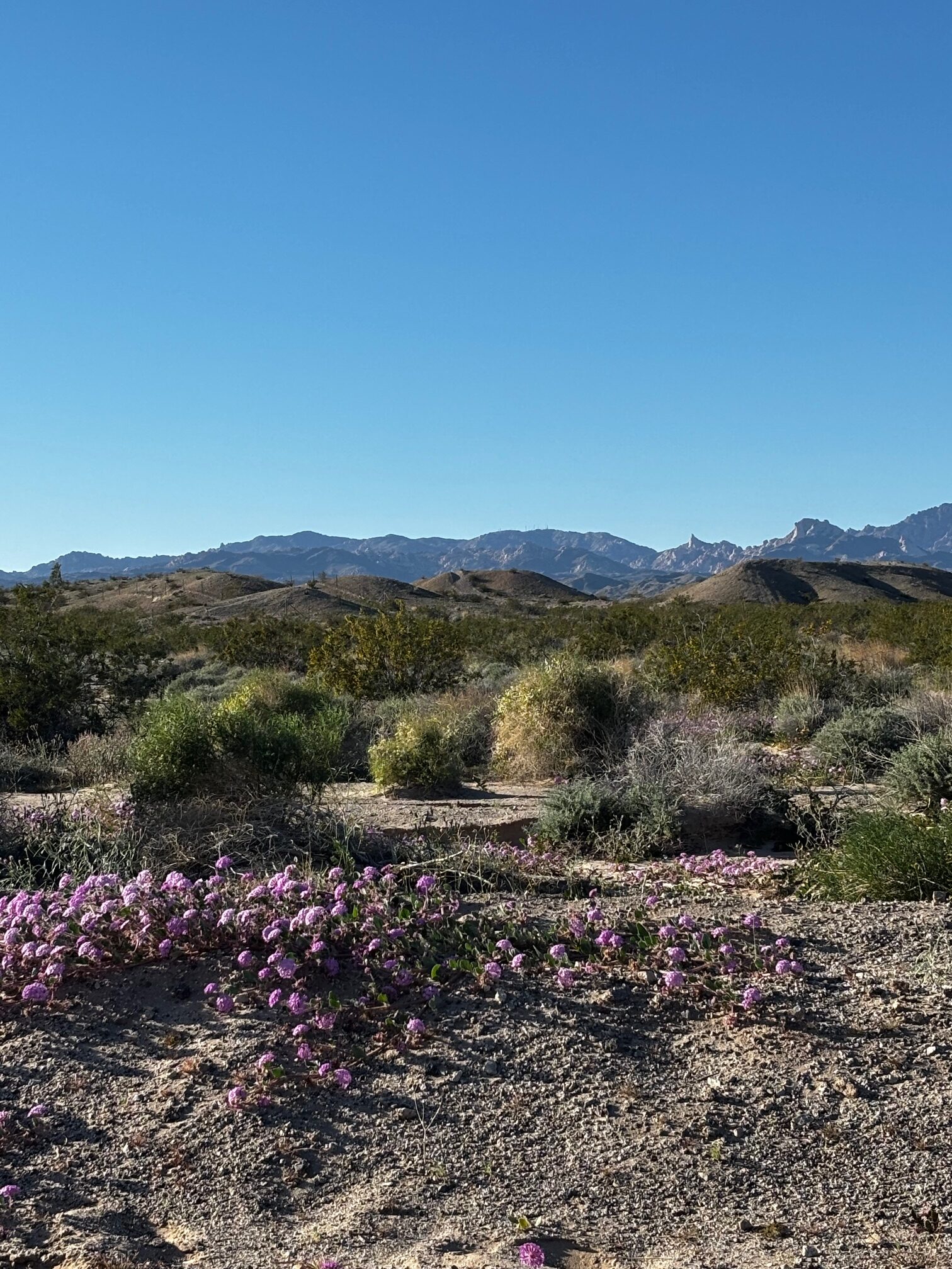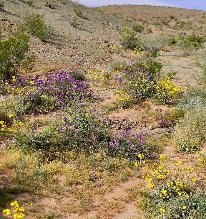 Feb 7, 2026, Richard report: The first verbena and lilies are blooming adjacent to Casino Drive in Laughlin. We have had no poppies yet out in Oatman, but the desert floor is quite green there.