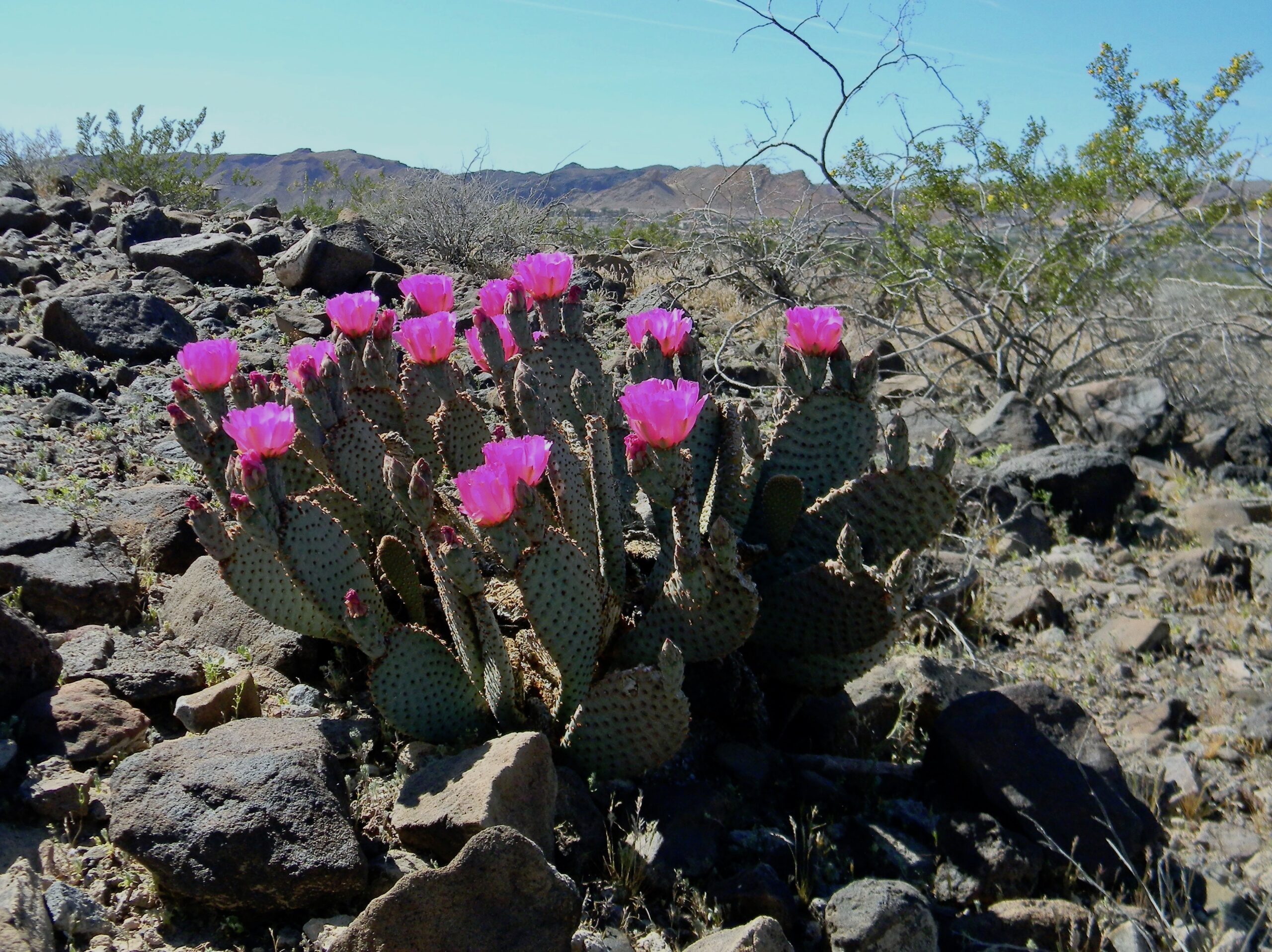 Mar 19, 2026, Rick & Margarita report: I drove Northshore Rd for about 20 miles at Lake Mead National Recreation Area. A lot of flowers are getting pretty dried out and past their peak. But the cacti are just getting started. Lots and lots of blooms on them.