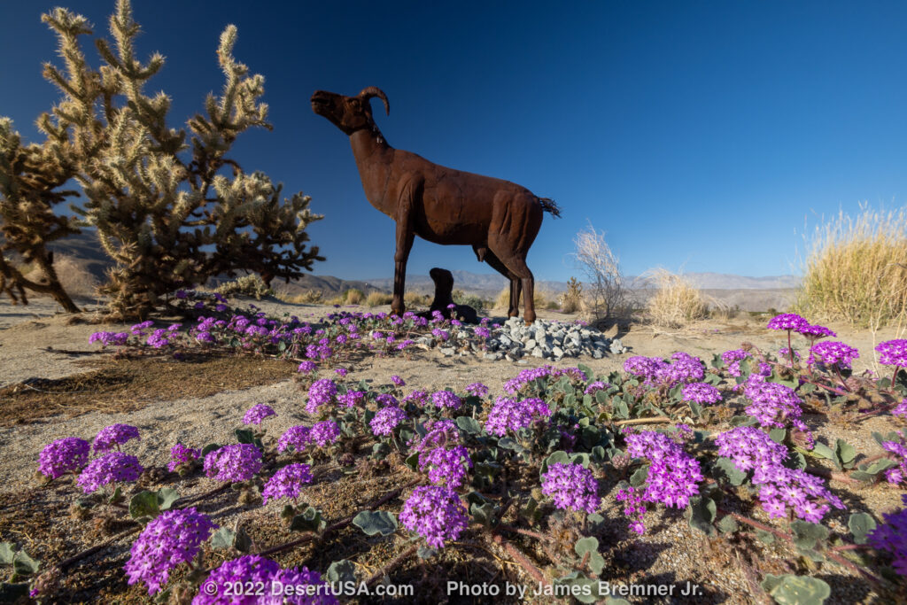 The purple blooms of sand verbena with a sculpture of a bighorn sheep in the background. Photo taken in Anza-Borrego Desert State Park area.