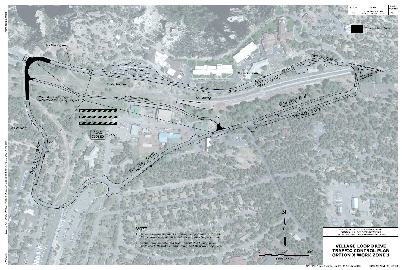 During this first phase of construction, Village Loop Road between the west end of Bright Angel Lodge parking lot and the south end of the Maswik Lodge complex will be closed and detours will be in place. Traffic from the El Tovar Hotel to the west end of the Bright Angel Lodge parking lot will become two-way traffic. To accommodate this, there will be no street-side parking for visitors or residents near the El Tovar, Kachina, Thunderbird, and Bright Angel lodges, Colter Hall, or the Train Depot. Buses and oversize vehicles will be able to turn around using the Bright Angel Lodge parking lot.