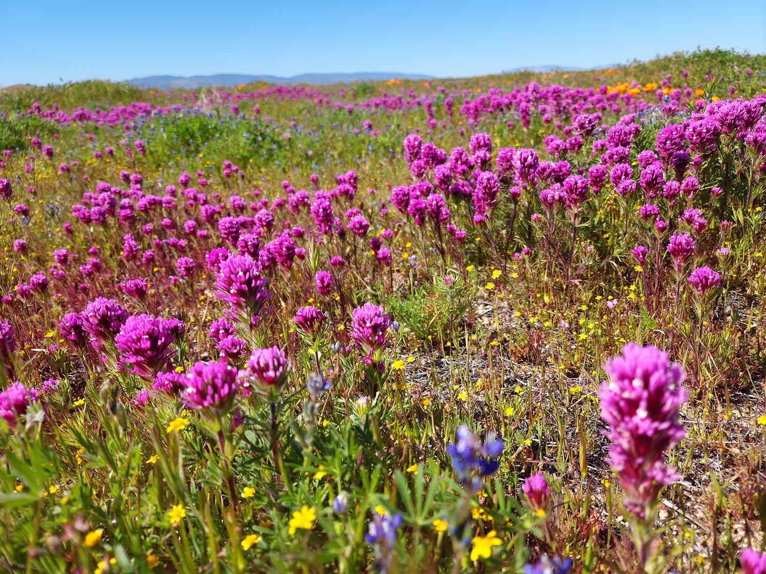 March 7, 2026, Antelope Valley, California poppy reserve Reports: Contrary to the news articles, this is not a “superbloom” year. While there is no definition of what a superbloom is, when many people envision one at the Poppy Reserve, they think of carpets of poppies over the hillsides that stretch as far as the eye can see. This is not one of those years. It is clear that more time will not improve the bloom conditions. Some poppies are already producing seed capsules. Visitors will be wowed with lots of wildflowers, especially owl’s clover, but not acres of poppies. That being said, it is GORGEOUS. How long will the bloom last? That entirely depends on the weather. If we get warmer temperatures, the bloom may be over sometime in April. If it is cooler, the bloom could last longer. Only the Mojave Desert knows. Click here for live views of the Poppy Reserve!