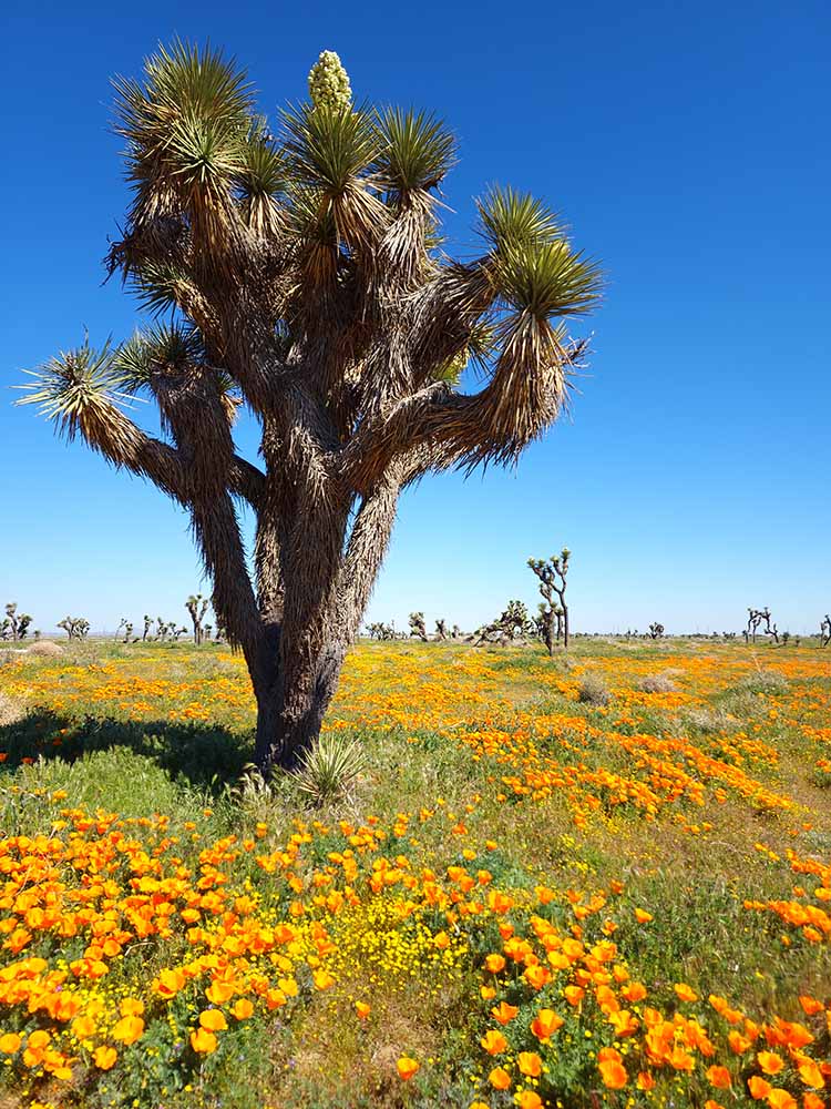 March 21, 2026, John Reports: Southern California, Antelope Valley, March 17, 2026. Pictures 1 and 2: A large grove of Joshua trees are in bloom, with Goldfields carpeting the ground in the area. About one mile north of W Ave D (Hwy 138) on 170th St. W. Picture 3: The most dense display of California poppies in area. About a half mile south of W Ave D on 120th St. W (dirt road with power lines).