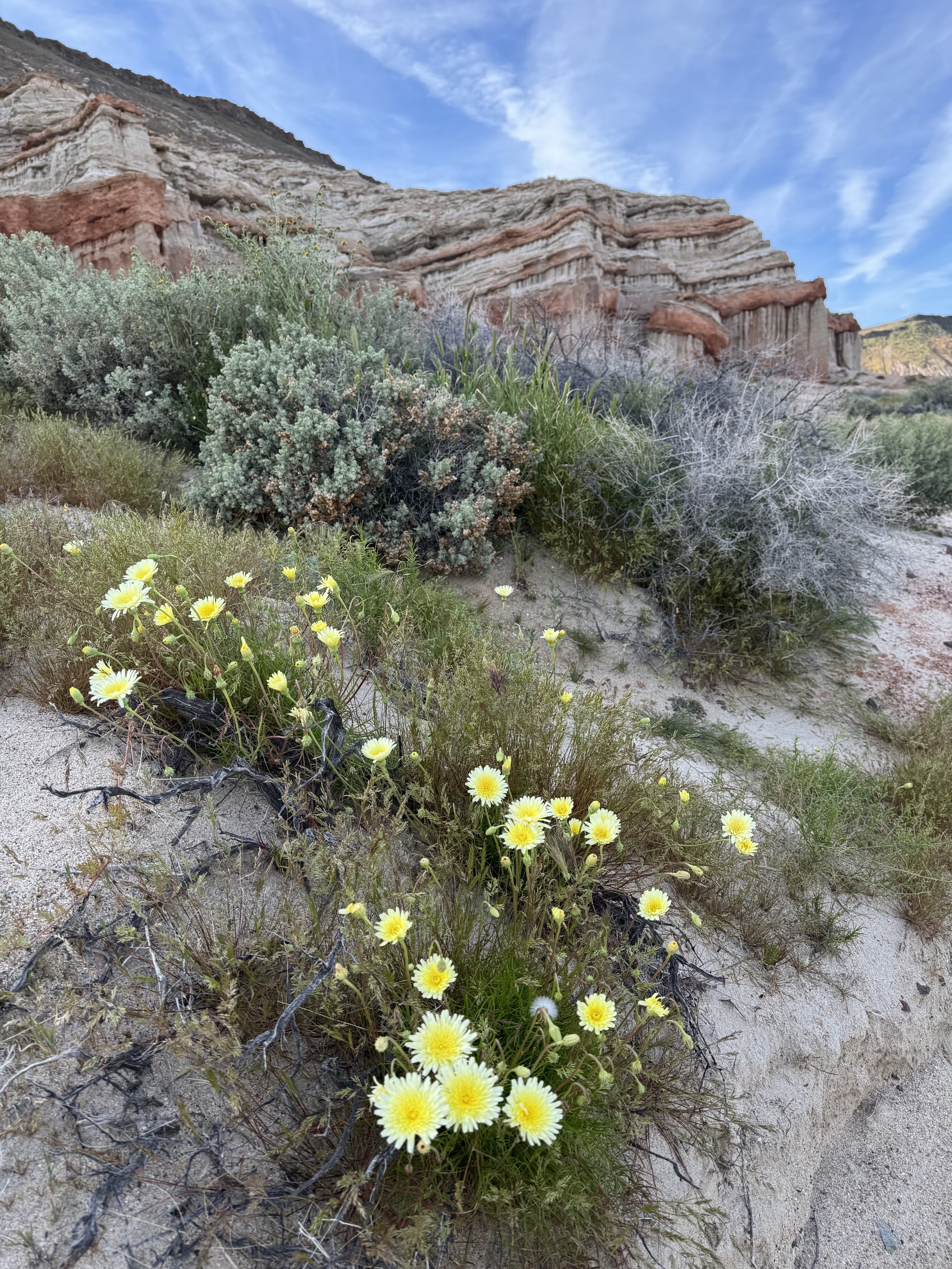 March 1, 2026 Jennie Reports: A brief wildflower report from the Red Rock Canyon State Park on Feb 26, 2026. There are isolated spots of flowers in the park, as shown in this photo of the desert dandelion.