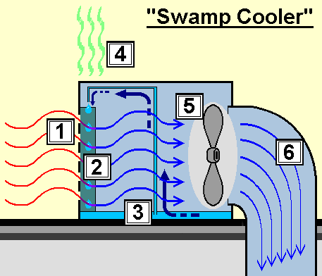 At the bottom of the box is a reservoir of water [3], with a tube running down into it. At the top is the other end of the tube, with a “spider” attachment of hoses or some other trickle mechanism. These spread across the top of the box to the sides. The ends of the hoses are above the top edges of the pads. A pump runs a continuous trickle of water over the pads, keeping them wet, the water runs through them and collects again in the reservoir and water is recycled and is refilled as it evaporates. At the entrance to the duct is a large fan [5] which sucks hot air from the outside [1] in through the wet pads [2], where they are cooled by evaporation [4], the air is then blown down into the house [6]. Or as I like to explain it, air is sucked through pads dripping with re-circulated water, the same cooled air is blown down a vent to cool the house.